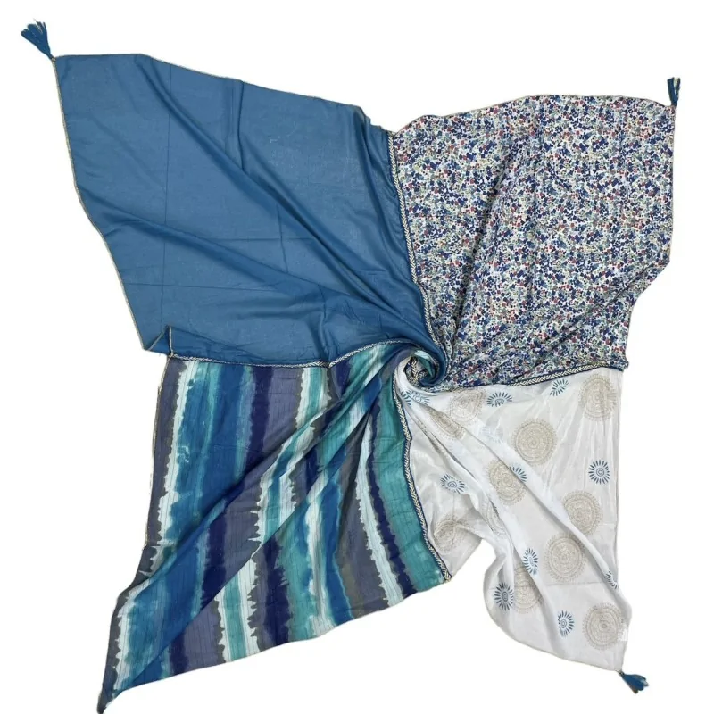 This patchwork scarf is a real chameleon piece, offering four style options in a single accessory. Perfect for those who love to vary their look effortlessly, it combines tie & dye and liberty patterns in enticing shades of blue. Made in a soft and breathable blend of 50% viscose and 50% cotton, this large 140x140 cm scarf wraps perfectly for optimal comfort while adding a touch of freshness to your daily outfits.