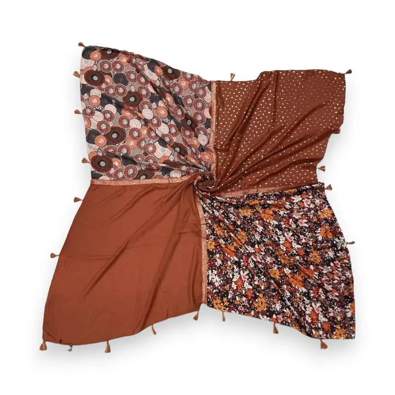 This square patchwork scarf stands out with its 4 sides featuring different but complementary patterns. On one side, you'll find delicate liberty prints with small romantic flowers. On the other, geometric circle patterns intertwine harmoniously. The whole is available in warm brick tones, creating a trendy autumnal color scheme. This combination of varied patterns brings dynamism and allows for style variations depending on how the scarf is worn. A true chameleon accessory that will adapt to all your outfits!