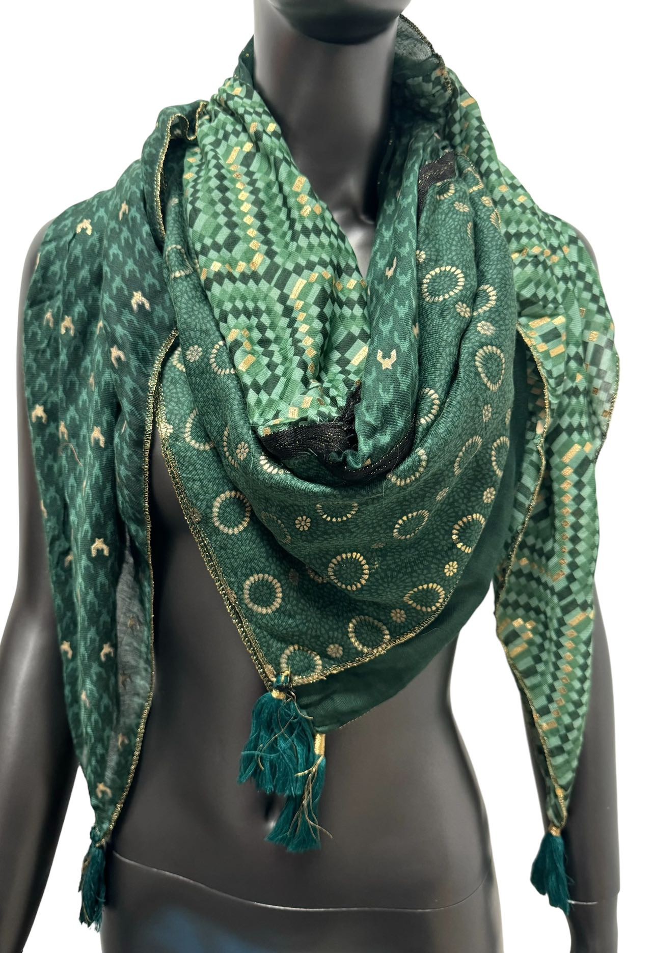 The innovation of this scarf lies in its ability to offer four different looks in a single accessory. The meticulous patchwork creates captivating visual harmonies, while the golden finishes highlight each detail with refinement. Its polyester composition ensures optimal resistance to creases and deformations, thus preserving the beauty of your draping day after day.
