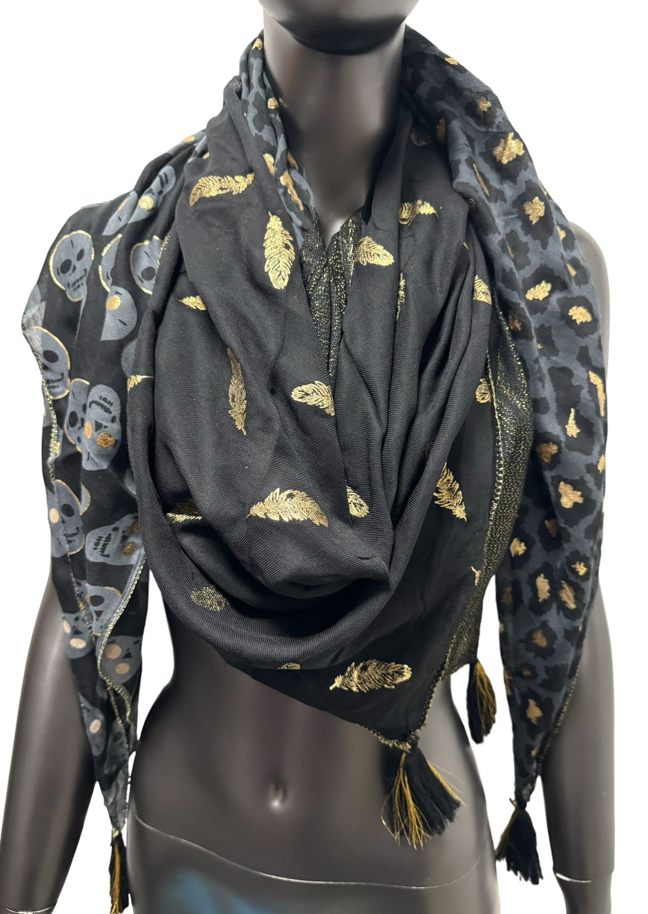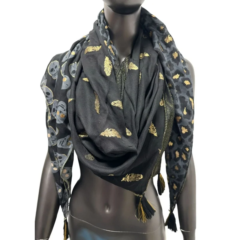 Embrace a bold style with this unique patchwork square scarf featuring skull and leopard prints. This stunning fashion accessory harmoniously combines rock patterns with refined golden feathers on a grey and black base. Made from high-quality polyester, it offers a generous 140x140cm dimension with an elegant black-gold solid reverse side for a versatile and sophisticated look.
