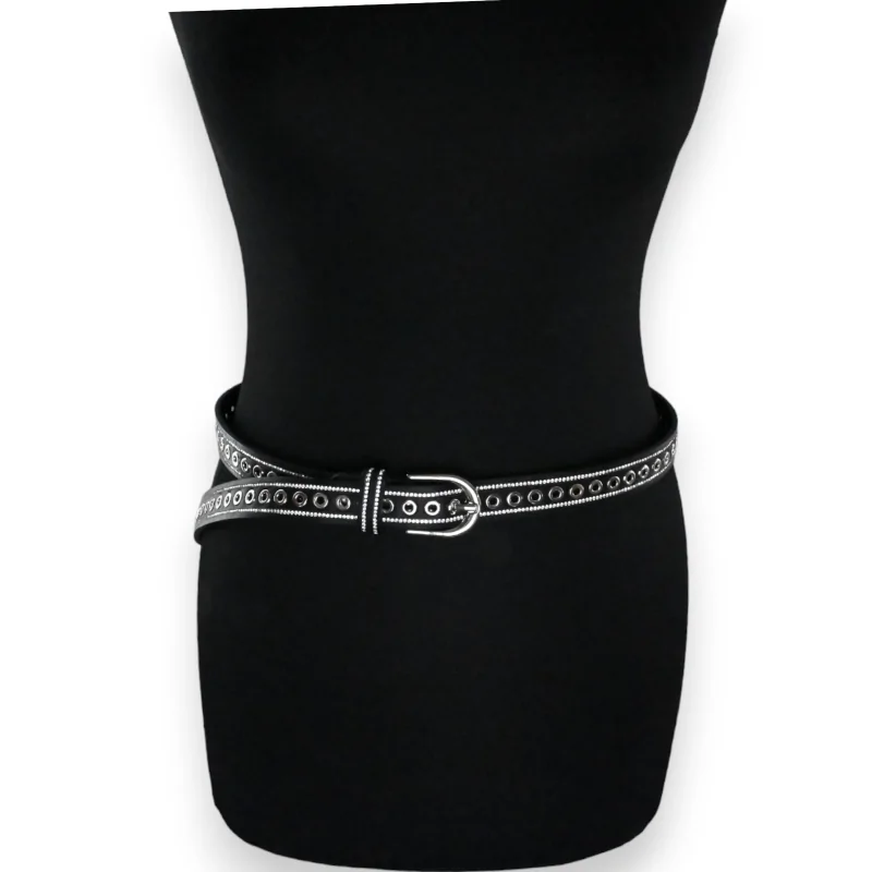 This black women's belt exudes timeless elegance with a contemporary silver touch. It is crafted from cowhide leather and features silver studs all along the length, which not only look great but also allow for an adjustable fit to perfectly accentuate your figure and complete your look. For a glamorous finish, sparkling rhinestones delicately adorn the top and bottom edges of the belt. A perfect blend of functionality and style.