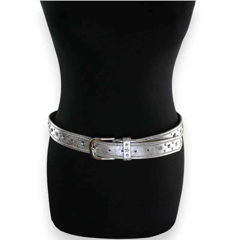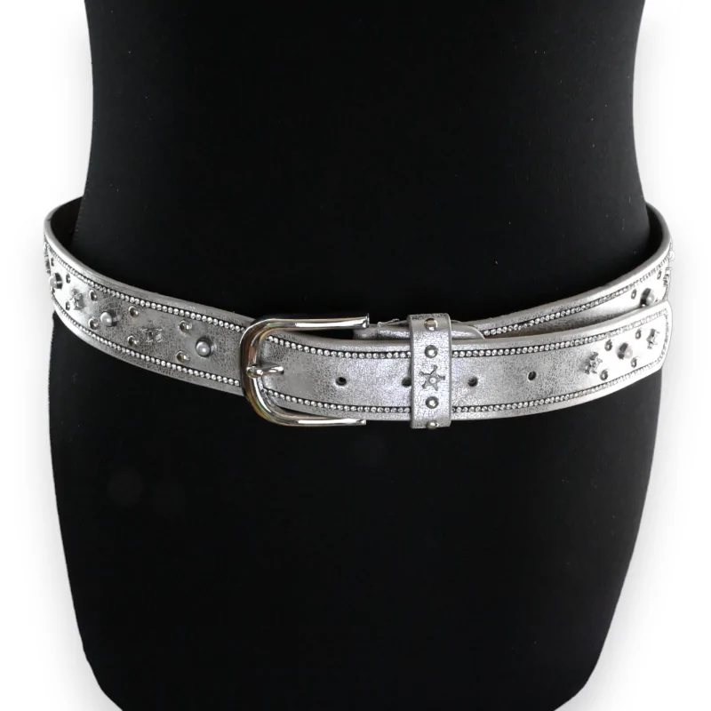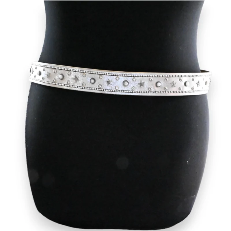 This belt for women is crafted with care from white cowhide leather, combining elegance and boldness in perfect harmony. It stands out with its meticulous details, adorned with carefully arranged studs that create floral patterns along its length, adding a feminine and contemporary touch to this timeless piece.