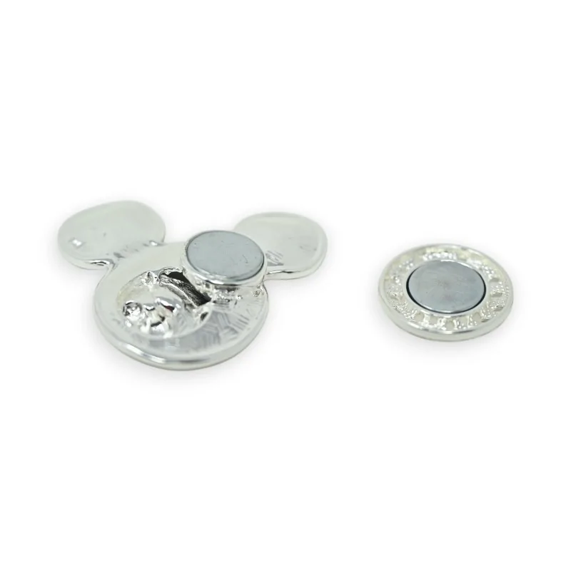 This silver magnetic brooch represents an adorable stylized mouse head with its characteristic round ears. Made of high-quality metal with a refined silver finish, it measures 5 cm in diameter. Its iconic and timeless design makes it both a playful and elegant fashion accessory, perfect for personalizing your outfits with a touch of whimsy. The magnetic fastening system allows for easy and secure attachment to your clothes without damaging them. The hammered finish of the metal creates beautiful reflections that catch the light, while the carefully crafted details of the silhouette give this brooch all its nostalgic charm.