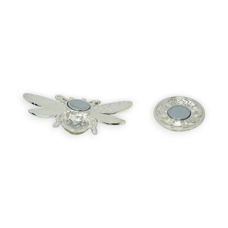 This magnificent silver-plated metal bee brooch is a true piece of craftsmanship that combines elegance and originality. Measuring 7 centimeters, it stands out with its delicate wings in pastel shades and its striped body in vibrant colors reminiscent of a rainbow. The precisely applied colored enamel creates a striking visual effect, while the magnetic backing allows for easy and secure attachment to your clothing. Every detail of this brooch has been designed to create an accessory that is both sophisticated and playful. The silver finishes highlight the shades of pink, blue, green, and yellow, creating a harmonious contrast that subtly catches the eye. This unique piece will quickly become your favorite accessory to brighten up your everyday outfits or special occasions.