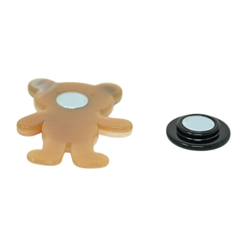 This charming magnetic brooch features a stylized teddy bear in beige resin, measuring 4.5x7.5cm. Its clean design highlights careful details such as its large expressive eyes and elegant golden bow tie, which gives it a touch of sophistication. The pearlescent finish of the resin adds a delicate shine that subtly catches the light. This fashion accessory perfectly combines kawaii style and classic elegance. Its magnetic fastening system allows for easy and secure attachment to your favorite clothes or accessories, without risking damage to fabrics. The balanced size of the brooch makes it sufficiently visible to make an impact while remaining discreet.