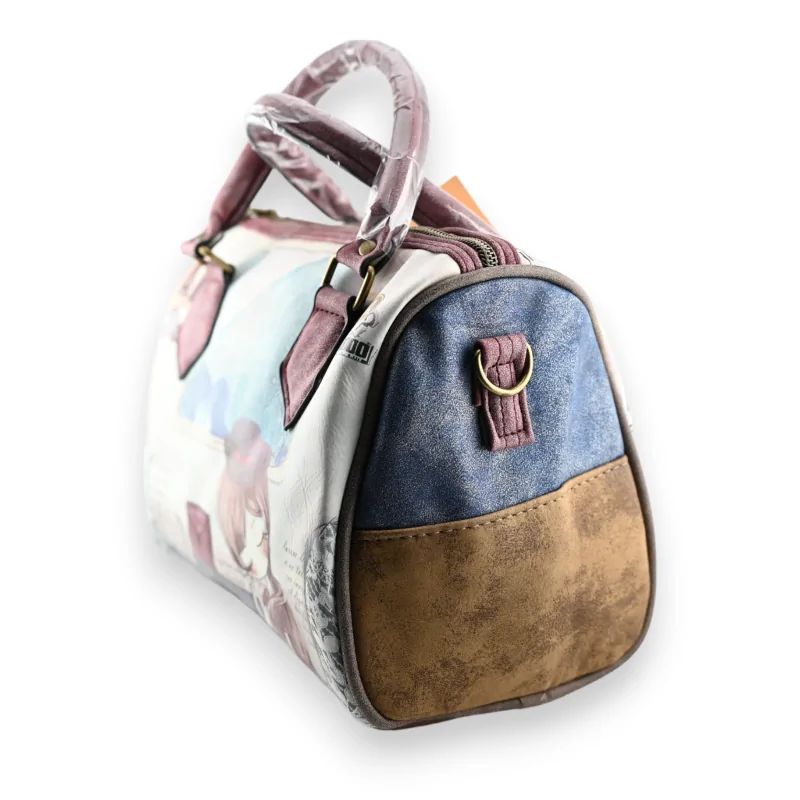 Redefine your style with this innovative handbag, whose silhouette is inspired by bowling bags, featuring a charming pattern of a little girl traveling on a train with her faithful animal companion. The design uses a range of subtle and elegant colors that perfectly complement any outfit, adding a subtle touch of refinement to your wardrobe. The well-organized interior space includes a spacious central pocket for your daily essentials, as well as a zippered inner pocket for small precious items, ensuring both accessibility and security. Flexibility is at the heart of this bag's design, thanks to its detachable strap that allows you to vary the carrying styles according to your preferences, whether it's by hand for a chic look or over the shoulder for a more casual appearance. Measuring 20x21 cm, this handbag brilliantly combines contemporary aesthetics and practicality, making it a preferred choice for those who seek to combine fashion and functionality.