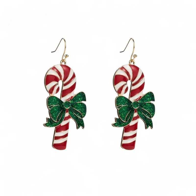 Add a festive touch to your look with these charming candy cane-shaped earrings. Made of gold-toned metal with a secure hook closure, they feature the iconic red and white candy cane pattern, adorned with a pretty glittery green bow. Measuring 4 cm in length, these costume jewelry pieces will bring a cheerful and elegant note to your holiday outfits. Perfect for celebrating Christmas in style!