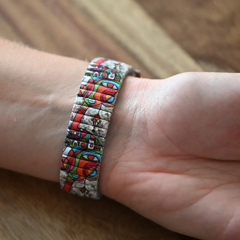 This watch, inspired by the famous painter Picasso, is a true work of art to wear. It captivates the gaze with its bright and multicolored hues, reminiscent of the daring and avant-garde canvases of the master. Each shade seems to tell a story, reflecting the passion and creativity that characterize Picasso's works. Featuring an elastic strap, the watch ensures optimal hold while perfectly conforming to the shape of the wrist. Its design combines practicality with artistic sophistication, offering a unique piece for art and fashion lovers alike. It's more than just a simple watch accessory; it's a vibrant tribute to one of the greatest artists of the twentieth century, perfect for those looking to express their love for art through every detail of their outfit.