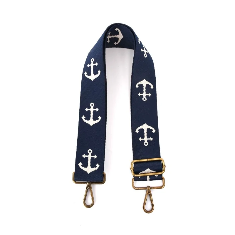 This elegant fabric shoulder strap combines nautical style with everyday practicality. Its pattern of white anchors on a navy blue background adds a trendy nautical touch to all your bags. With its comfortable width of 5 cm and adjustable length from 60 to 120 cm, it adapts perfectly to your body shape. The aged gold snap hooks at the ends allow for easy and secure attachment to your favorite bag.