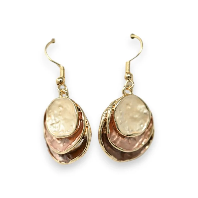 Let yourself be seduced by this fantasy set, a true treasure of sophistication. Conceived to enhance your outfits, it consists of finely matched earrings, each representing a delicate succession of embossed circles. These motifs, bathed in captivating brown shades, elegantly stand out on a golden metal base, evoking an essence that is both chic and glamorous. The set is complemented with a small extension, allowing you to perfectly adjust the set according to your desires. An invitation to celebrate your unique style, this set promises to enchant your most precious moments with an unmatched touch of refinement.