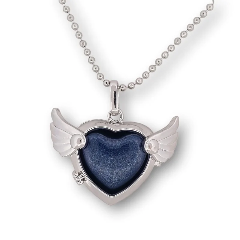 The Pretty Heart openable heart necklace enhances your style with its unique design adorned with delicately crafted angel wings. This fashion jewelry reveals an exceptional feature: a secret compartment to hold a small blue heart-shaped stone. The quality silver finish and refined wing details bring an incomparable touch of elegance to your jewelry collection.