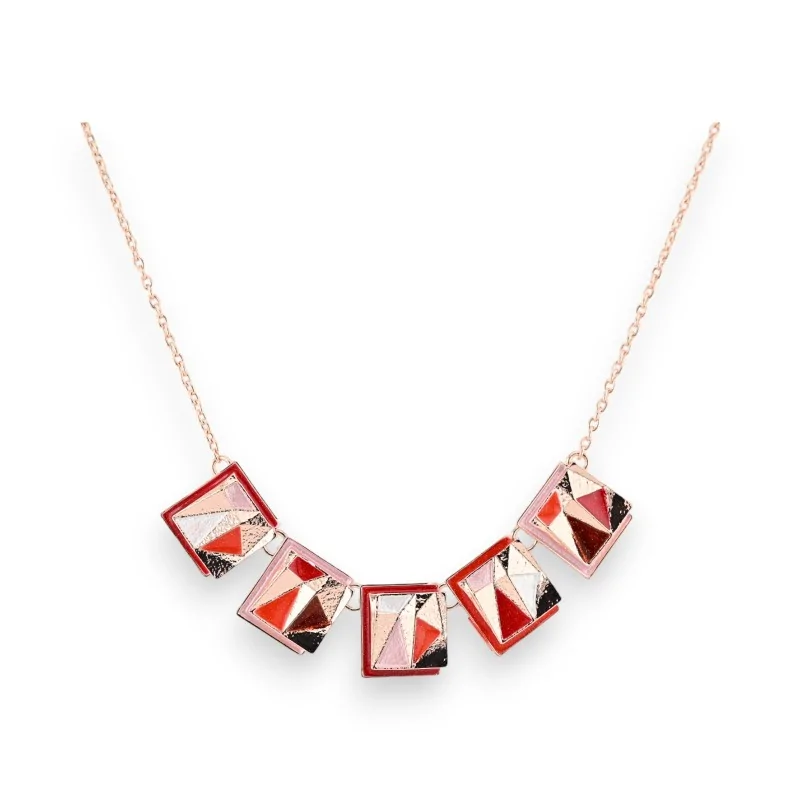 This fashion necklace by Ikita stands out with its modern and elegant geometric style. Composed of several squares in rose-gold colored metal, each adorned with abstract patterns in shades of red, it adds a touch of originality to your outfits. Its length of 20 cm, adjustable thanks to a 4 cm extension, allows it to adapt to different necklines. A trendy piece of jewelry that will enhance your looks with style.