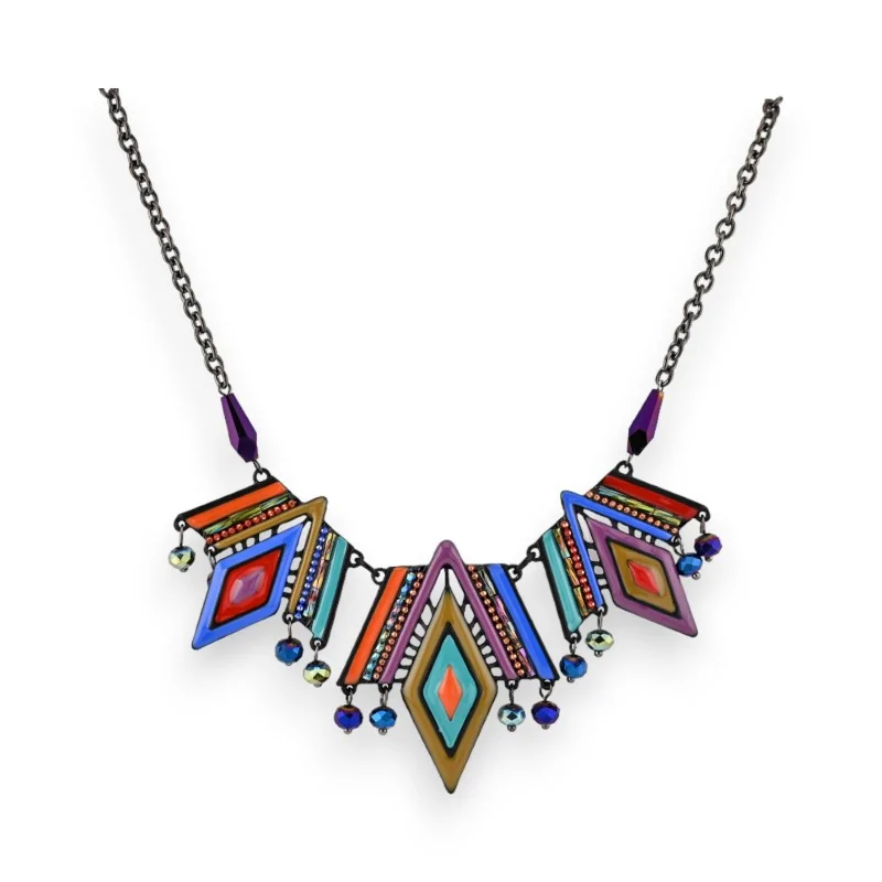 This fashion necklace stands out with its resolutely modern and bold design. The centerpiece is composed of several geometric shapes, mainly diamonds, arranged asymmetrically to create a dynamic and original effect. Each element features a different vibrant color, forming a harmonious and sparkling ensemble that is sure to catch the eye.