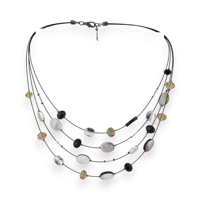 This women's fashion necklace by Ikita brand captivates with its airy and elegant design. Its multi-strand style adds volume and movement, for a very feminine result. The beads and cabochons are delicately arranged on ultra-thin black threads, creating a lightweight effect. There is a harmonious blend of soft hues - mother-of-pearl, gray, black and champagne - that will easily match many outfits. The finesse of the materials and the meticulous attention to detail reveal all of Ikita brand's expertise in creating high-end fashion jewelry.
