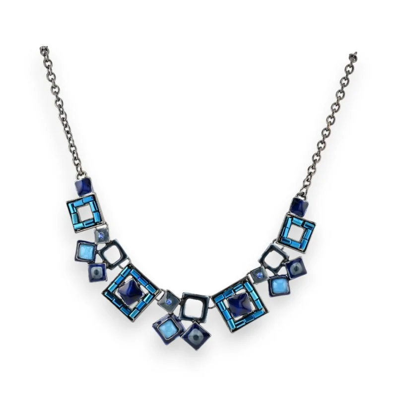 The design of this fashion necklace stands out for its contemporary geometric aspect. The square and rectangular shapes come together to create a dynamic and captivating pattern. The different shades of blue used, ranging from deep navy to bright sky blue, bring depth and contrast to the whole. This combination of shapes and colors makes this jewelry a versatile accessory, able to match both casual and more formal outfits.