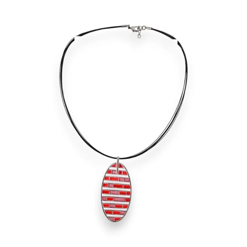 The mosaic pendant is undoubtedly the standout element of this necklace. Its modern and sleek oval shape showcases the intricate pattern adorning its surface. The small red and pink rectangles, arranged rhythmically, evoke meticulous artisanal work. This geometric composition brings an artistic dimension to the jewelry, making it unique and captivating. The Ikita manufacturing quality is evident in every detail, ensuring a durable piece of jewelry resistant to daily wear.