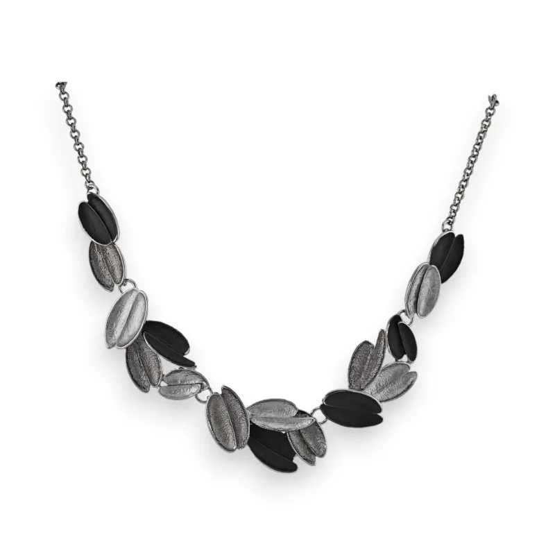The Ikita Petals fashion necklace stands out with its original and refined design. Inspired by the delicacy of flowers, this jewellery piece consists of a succession of oval metal elements, reminiscent of petals. The harmonious alternation between silver and black pieces creates an elegant contrast that catches the eye. Each "petal" is finely crafted, with a smooth surface for the black elements and a slightly hammered texture for the silver pieces, adding relief and depth to the jewellery.