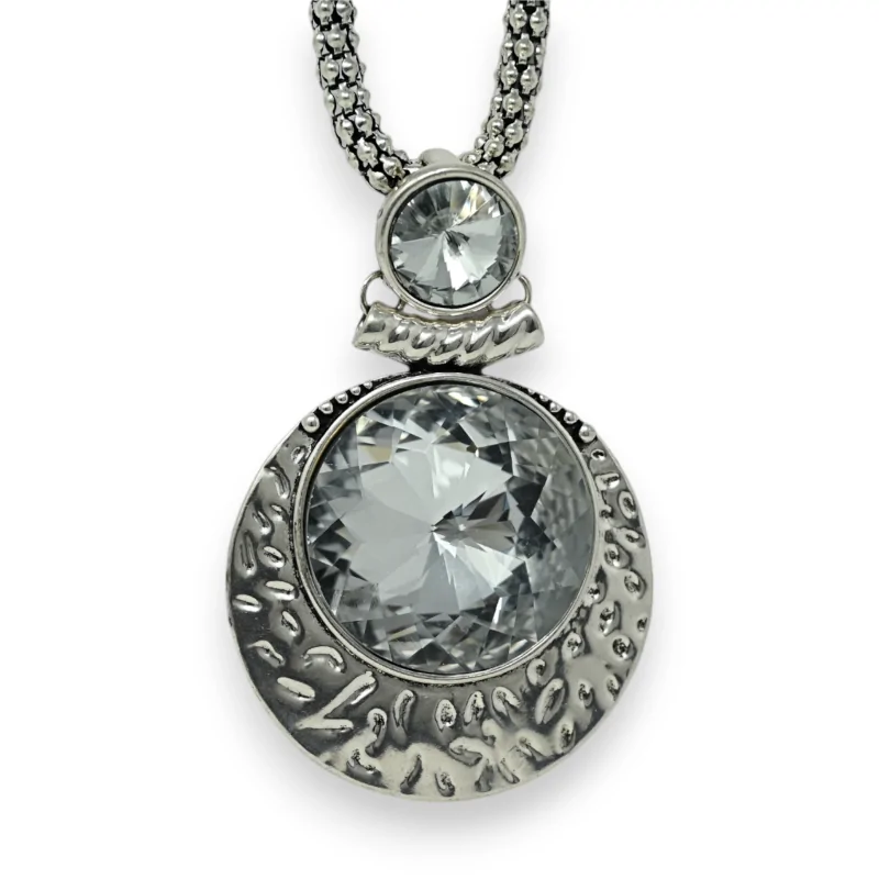 This exceptional fashion necklace perfectly embodies the art of vintage jewelry with its finely engraved aged silver finish. Its spectacular 10cm medallion forms the true heart of this exceptional piece, showcasing a voluminous white stone that instantly captivates the eye with its remarkable brilliance.
