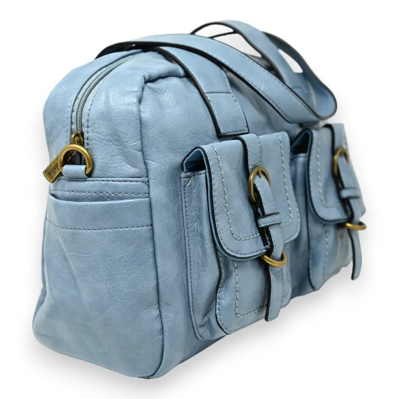 The Elena handbag stands out with its rounded and streamlined silhouette, enhanced by a timeless sky blue shade. The antique gold metal finishes on the front buckles add a touch of sophistication, while the double front pockets create an elegant symmetry. The texture of the premium synthetic material offers a finish comparable to genuine leather, with a subtle grain that delicately catches the light.