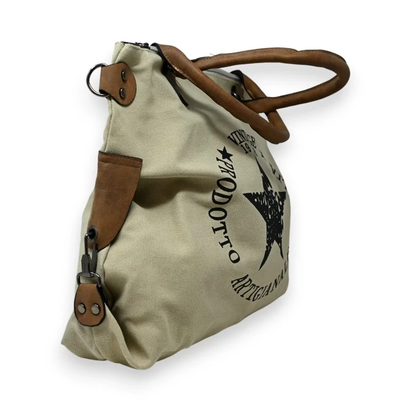 Discover the undeniable charm of this vintage handbag made of thick fabric. Its elegant design is highlighted by a central black star, surrounded by matching written patterns on an appealing beige background. The synthetic camel-colored finishes add a touch of elegance, especially with a matching shoulder strap allowing for different carrying styles. For quick adaptation, the bag is equipped with a carabiner hook on each side, allowing you to shorten it and transform its appearance. A zippered pocket at the back and a large central pocket, secured by a zipper, offer generous space, complemented by patch pockets on the sides for optimal organization. This bag measures 45 cm wide by 42 cm high, combining functionality and style.