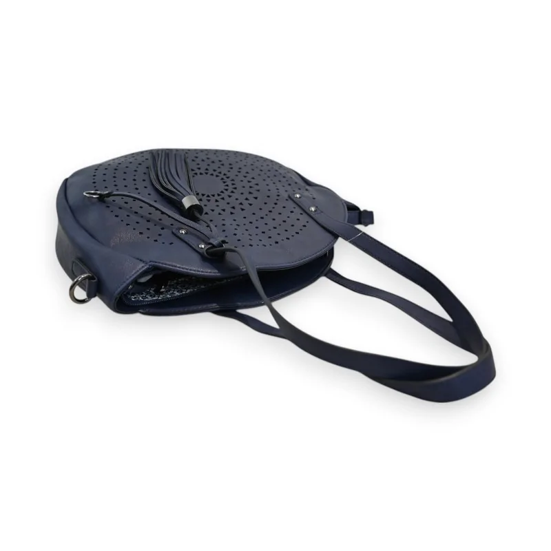The Mélanie Paris handbag stands out with its sophisticated perforated mandala pattern adorning its front face. This precise laser-cut creates a subtle play of light while adding an artistic touch to the design. The timeless navy blue shade perfectly matches all outfits, from casual to dressy. The meticulous finishes, such as the faux leather tassel and silver metallic details, reveal the attention to detail.