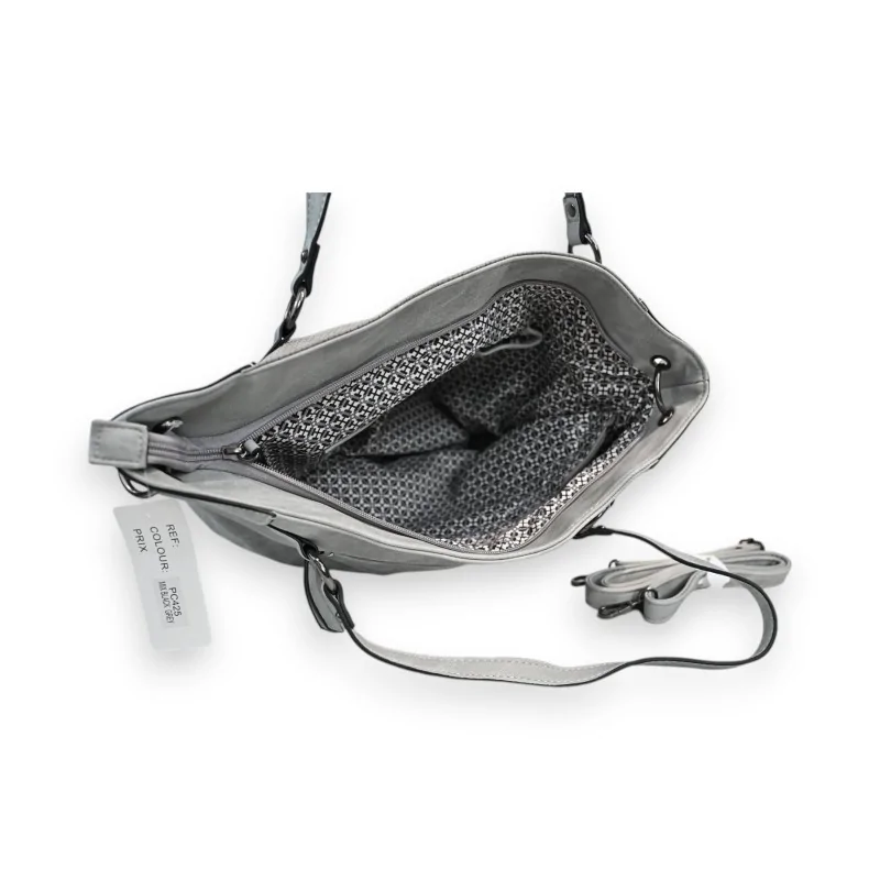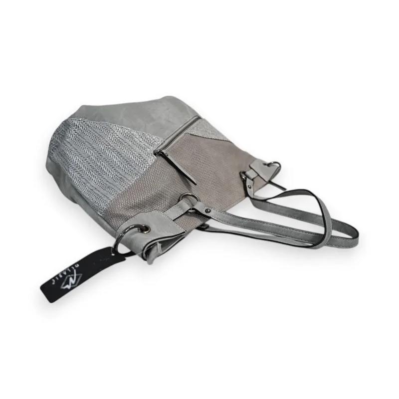 The Mélanie Paris handbag in light gray synthetic material stands out with its unique design blending different textures in an elegant tone-on-tone patchwork. Its multiple cleverly arranged compartments make it an accessory that is as practical as it is trendy for a well-organized daily life.