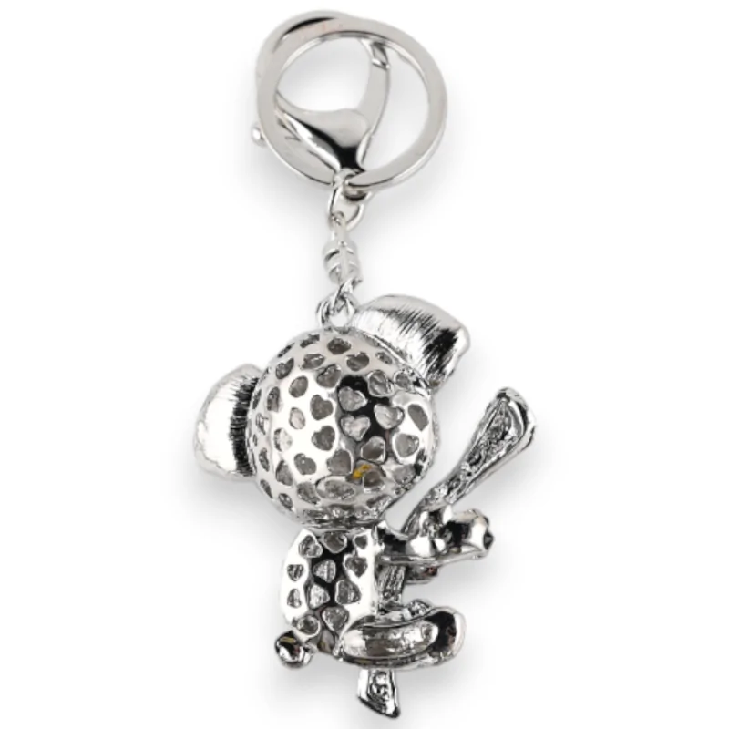 Evoking the very essence of sweetness, this silver keychain delicately presents the representation of an adorable koala, perched on its branch, as if to observe the world from its secure height. The choice of black and white tones evokes the natural palette of the koala, while offering a chic and timeless look. But what really makes this keychain unique are the sparkling rhinestones that cover it, reflecting each ray of light and adding a special sparkle to this everyday object. Measuring 6 cm without its attachment, it is the perfect size to be easily spotted in a bag or pocket. A wonderful reminder of nature and its endearing creatures, this keychain is perfect for those who have a soft spot for animals or who appreciate a touch of elegance in their accessories.