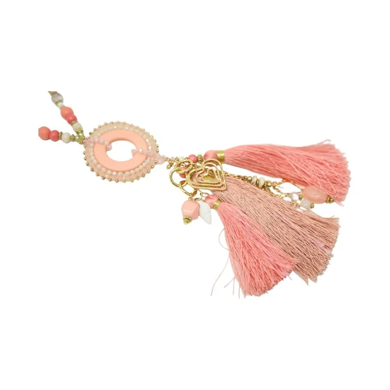 This 65 cm long necklace, bathed in a gradient of pink and coral, evokes the softness of a dawn in a tropical paradise. Adorned with beads and fantasy stones selected for their warm colors, this jewel embodies the meeting between passion and softness. The central medallion, a pierced circle surrounded by delicate beads, is a window open to a world of beauty and refinement. Tassels, in matching shades, add a touch of lightness, while heart-shaped charms, precious stones, shells, and gold chains tell stories of hidden wonders and discovered treasures. This necklace, a hymn to the beauty of tropical landscapes, is the perfect accessory to brighten up your outfit with a touch of exoticism and elegance.
