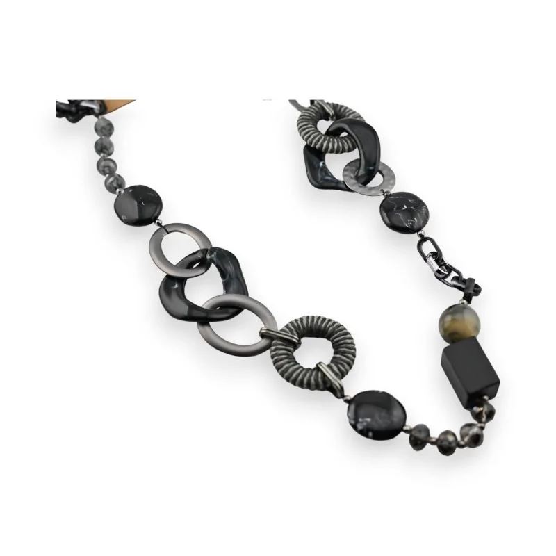 This stunning long necklace in shades of black and gray will add a touch of elegance to all your outfits. Its perfect length of 49 cm allows you to wear it with both V-necks and round necklines. The various shades of black and gray blend harmoniously to create a refined and versatile piece of jewelry, ideal for accessorizing your everyday looks as well as more formal occasions.