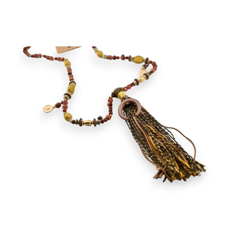 This bohemian-style long necklace enhances your style with its warm brown shades. With a length of 59 cm, it features various beads and an elegant tassel that gives it a chic ethnic look. Perfect for accessorizing your summer outfits or adding a bohemian touch to a more classic look. This fashion jewelry brilliantly combines a bohemian spirit with a refined finish. The natural-toned beads harmonize perfectly, creating a subtle gradient from beige to dark brown. The tassel adds movement and lightness to the ensemble, making this necklace a trendy and versatile accessory.