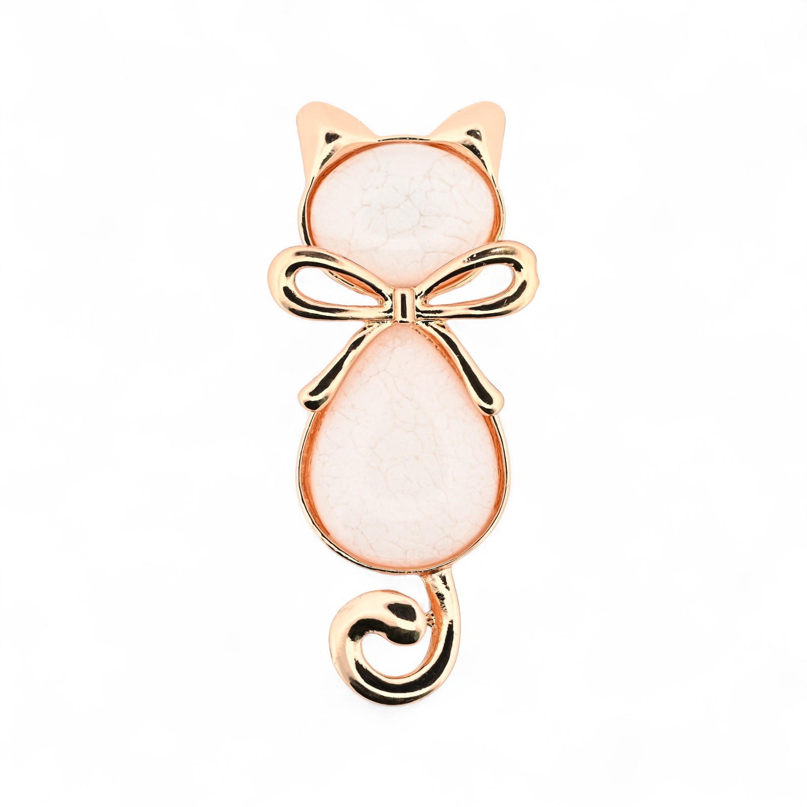 Pink Cat Magnetic Brooch with Gold Bow - Kawaii Feline Jewelry with Natural Stone