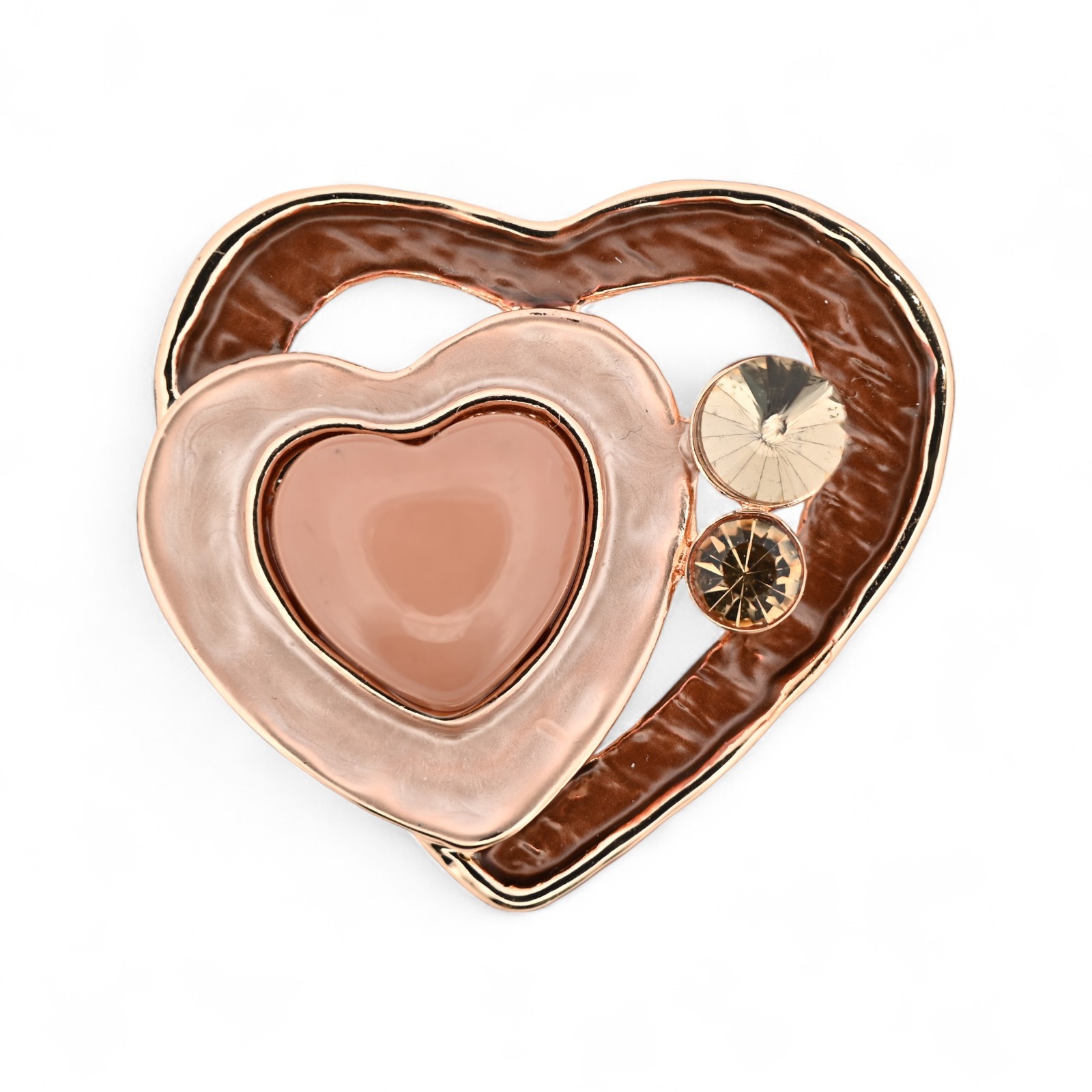 This rose gold double heart brooch embodies sophistication and romance with its delicate chocolate and pink hues. The refined design features a 3D overlapping double heart effect that creates striking visual depth. The large outer shiny chocolate brown heart contrasts harmoniously with the small luminous peach pink heart, while the central soft pink opaline heart brings a romantic softness. The two sparkling golden champagne rhinestones enhance the whole with subtle and refined brilliance. This elegant magnetic brooch perfectly blends warm tones to create a delicate and delicious harmony.