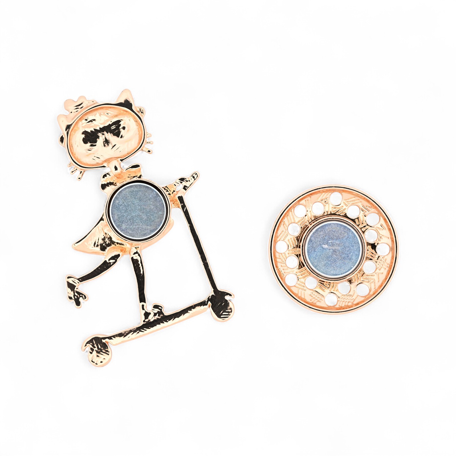 This magnetic brooch cat with glasses transcends traditional costume jewelry codes. The kawaii street art design captivates with its careful details: delicate golden whiskers, flared black dress with gray details, and scooter with perfectly proportioned gray wheels.