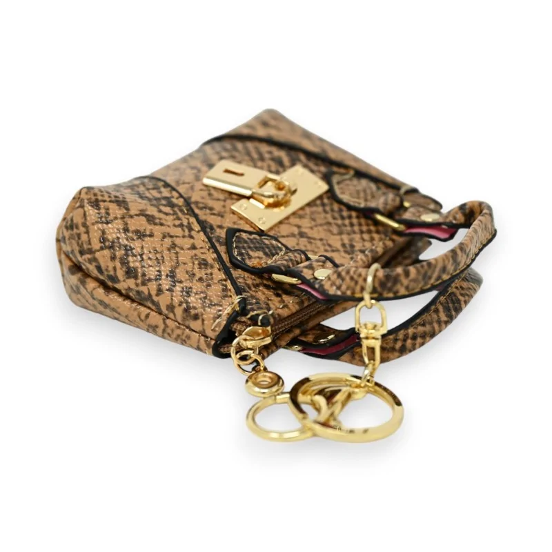This keyring and coin purse captivates with its snake print in shades of brown and black, evoking the natural elegance of a chic mini handbag. Adorned in the center with a small golden padlock, it combines security and sophistication. Easy to attach thanks to its carabiner and ring hook, you can fix it to various items such as bags or belt loops, making it ideal for daily use. The subtle zipper secures your small possessions, whether they be coins or small items. Compact and functional, with its dimensions of 11 x 8 cm, this keyring is both a practical and fashionable accessory.