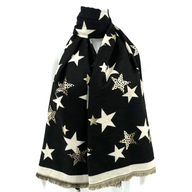 Wrap yourself in the exceptional softness of this fleece scarf with beige and gold star patterns on a black background. Made from high-quality polyester, it measures 70x190cm and provides optimal warmth while adding a touch of elegance to your winter outfits. Its unique stellar design enhances your style with refinement and modernity.