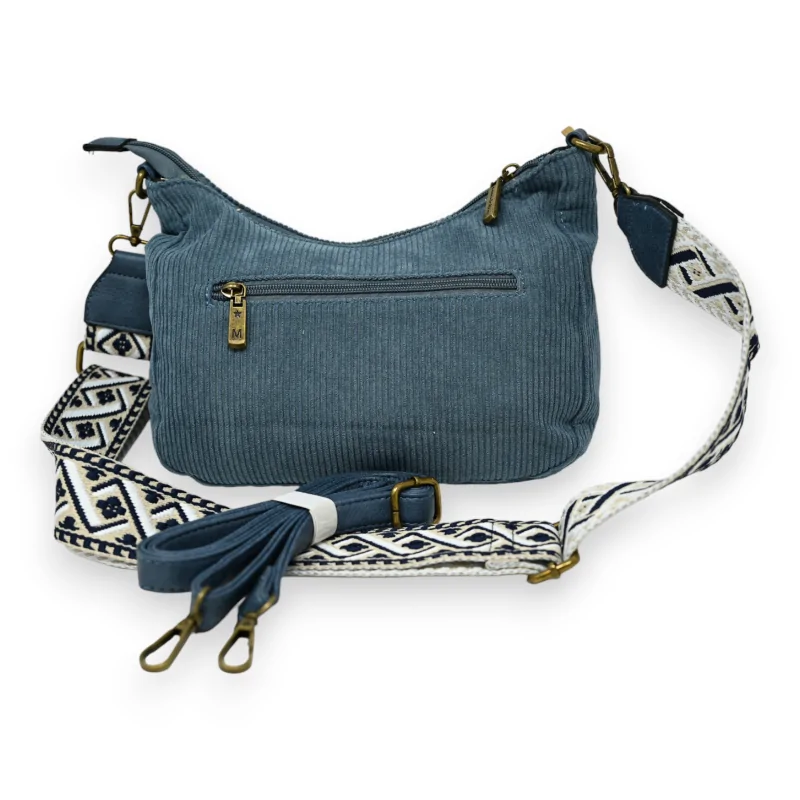 Discover the blue jeans velvet shoulder bag, a trendy accessory that combines practicality and style. With its two front pockets equipped with a magnetic opening system, this bag is perfect for those who prioritize quick and secure access to their personal belongings. The large central pocket, equipped with a divider, provides an organized space for your necessities, complemented by internal pockets for efficient space management. The rear pocket offers an additional storage solution, accessible and safe. The strap, made of printed and adjustable fabric, is not only practical but also a design element that perfectly matches the bag. This bag, measuring 31x20 cm, embodies the concept of functionality meeting style, ideal for everyday use with a distinctive touch of color.
