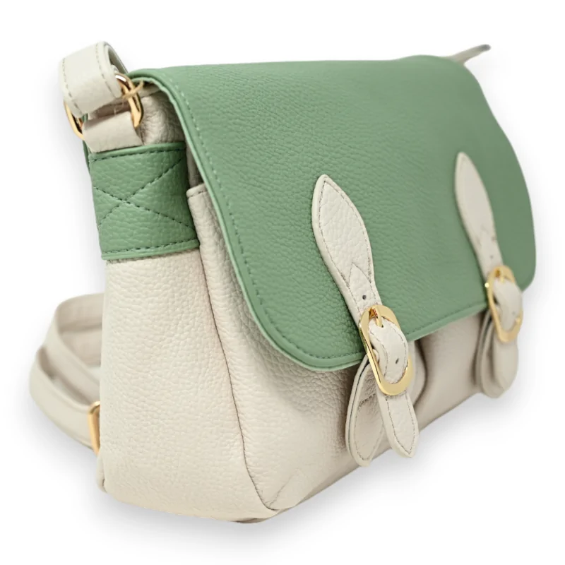 This shoulder bag, with its modern satchel look, stands out with its finish in subtle shades of beige and green, thanks to a synthetic material that brilliantly mimics the texture of genuine leather. The two magnetic straps offer secure and convenient opening, while the two front pockets are ideal for daily necessities. The bag's interior, carefully designed, includes a large central pocket with a divider for optimal organization and patch pockets for additional storage. The zippered back pocket provides extra protection for your personal belongings. Measuring 25x20 cm, this bag is a perfect blend of functional elegance, ideal for fashion enthusiasts looking for an accessory that is both practical and chic. Strap adjustable to your liking.