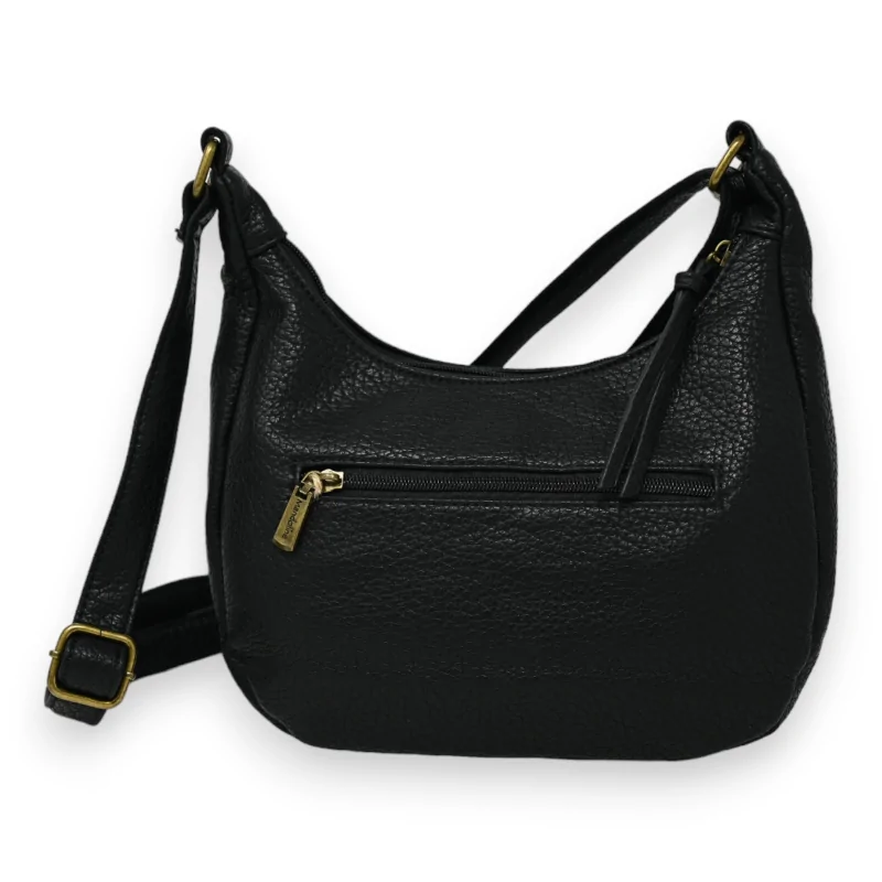 Discover this shoulder bag with a contemporary banana-shaped design, brilliantly interpreted in black for a striking effect. Made from superior synthetic material, this bag manages to emulate the rich texture of leather, demonstrating unmatched attention to detail. Its interior layout is designed for modern life, with a front pocket equipped with a magnetic clasp for simplified access, a large divided main pocket for better organization, and internal pockets for your small items. The external pocket at the back is perfect for items you want to keep within easy reach yet secure. Completed by an adjustable strap for a perfect fit, this bag measuring 26x22 cm is the perfect accessory to add a touch of luxury to your everyday life while remaining functional.