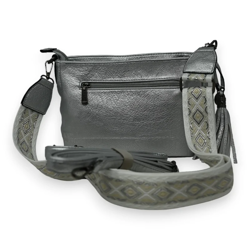Discover timeless elegance with this silver crossbody bag, a masterpiece of modern leatherwork. Made from a high-quality material that perfectly replicates the look and feel of real leather, this bag stands out with its utility and sophistication. On the front, two zipped pockets make access to your essentials easy, while a large center pocket, endowed with smart division and side-slit pockets, optimizes internal organization. An external pocket, discreetly located at the back, adds additional storage space. This model is completed by two interchangeable straps: a trendy fabric one for a casual look and another silver synthetic one for a touch of elegance, providing unmatched versatility to suit all occasions. Dimensions 30X20cm