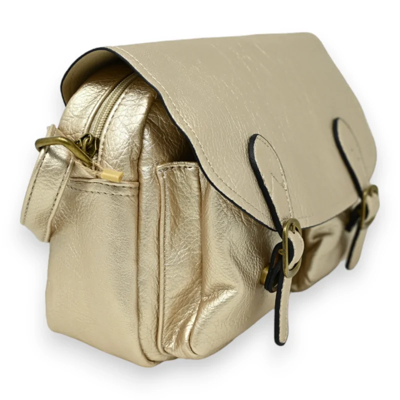 Adopt a chic look with this golden satchel shoulder bag, designed to combine aesthetics and organization. Its two magnetic straps at the front are not just a style detail, they also allow for easy opening and closing. The bag boasts two handy outside pockets, ideal for keeping small items and gadgets within reach. Inside, you will discover a spacious main pocket with a smart partition for better organization, complemented by various patch pockets to neatly store all your essentials. The presence of a rear pocket secured by a zip provides additional space for items requiring increased security. With an adjustable strap for a custom fit and generous dimensions of 28x20 cm, this bag is the perfect companion for those seeking a perfect blend of elegance, functionality, and comfort.