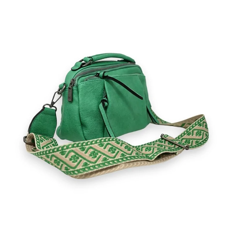 This square-shaped shoulder bag, coated in a charming Brazilian green, is perfect for completing your summer outfits with a touch of freshness. It is designed with an elegant handle on top, allowing handheld wear for a more sophisticated look. On the front, a clever little pocket is adorned with two side zippers, adding a practical and stylish detail. The top of the bag reveals not one, but two overlaid zippered pockets, optimising space and facilitating the organisation of your essentials. The interior is divided into two main compartments, each secured by its own zipper, and includes pockets on the sides for additional storage. At the back, an external pocket offers quick access to your frequently used items. You can choose between a printed fabric strap, perfectly matched to the bag's design, or a solid synthetic strap in the same Brazilian green tone. Practical dimensions of 25 cm in width by 17 cm in height.