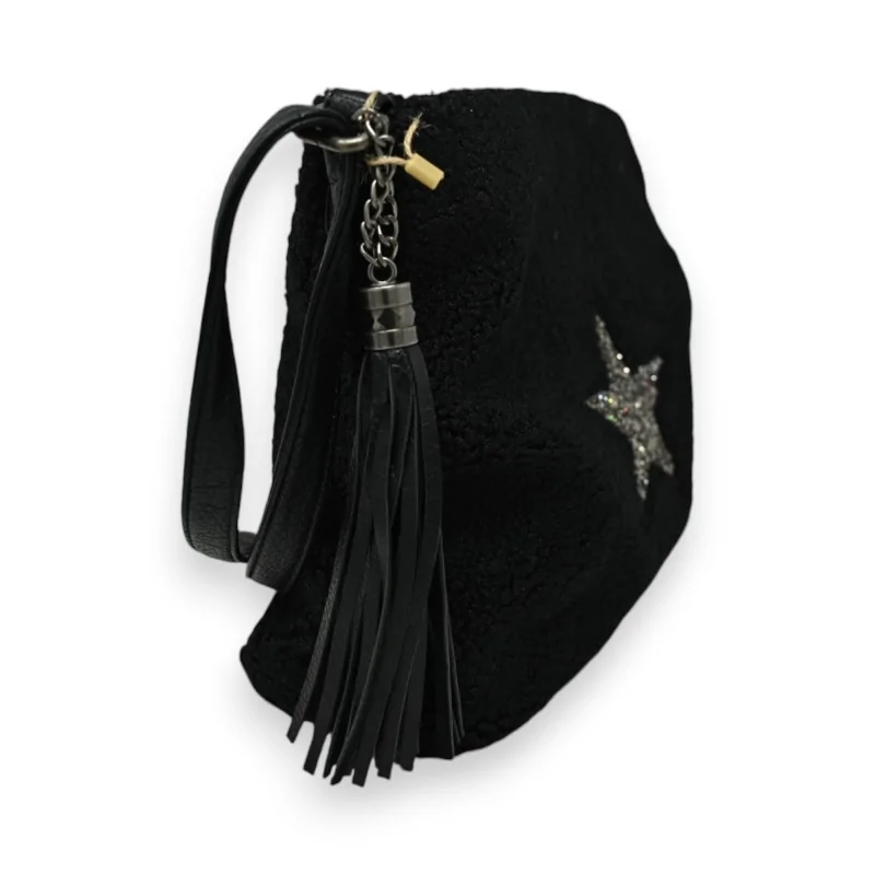 This Mandoline shoulder bag combines style and practicality. Made of black bouclé fabric, it features a beautiful sparkling star in the center that adds a touch of elegance. With its large central pocket including interior compartments and a divider, as well as a pocket on the back, it offers optimal storage. Its adjustable strap allows for comfortable wear. Dimensions: 30x25cm.