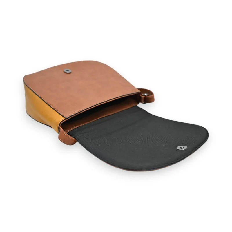 This Mélanie Paris crossbody bag stands out with its perfect blend of elegance and practicality. Its rigid design in camel and mustard tones is enhanced by a unique woven pattern mixing orange, beige, and black shades. The magnetic snap closure ensures easy and secure use.