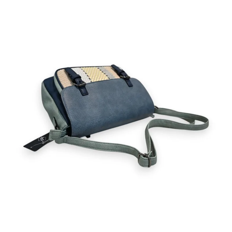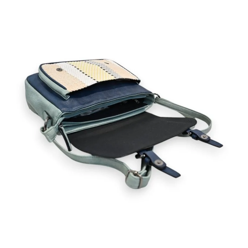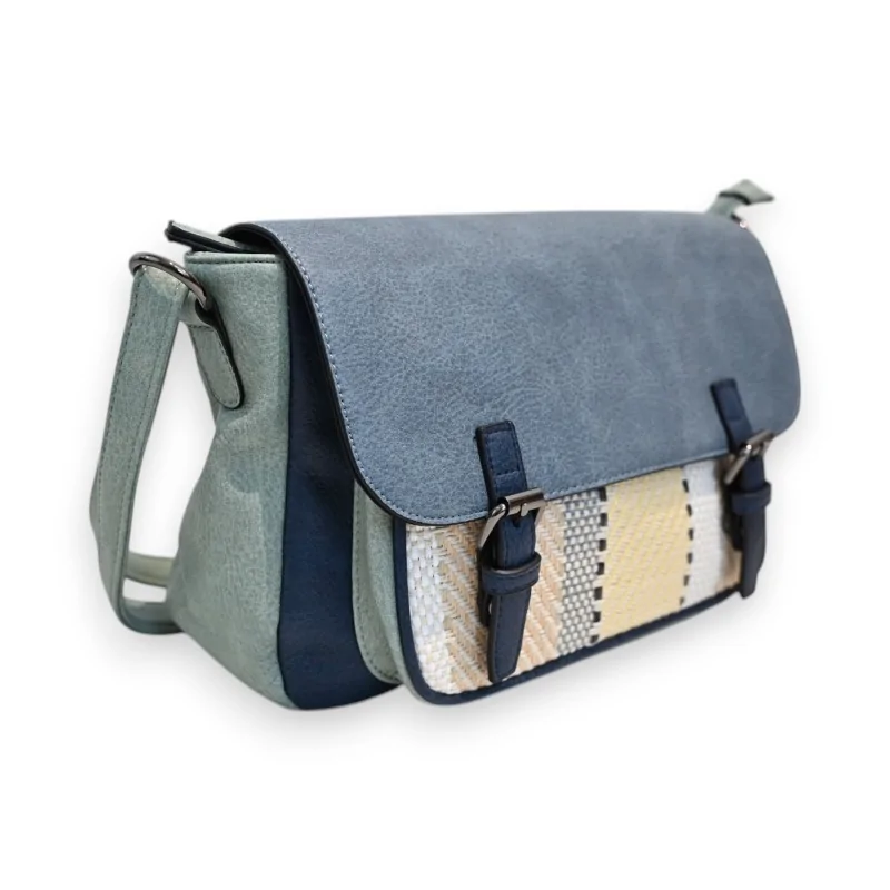 The Melanie Paris crossbody bag stands out with its contemporary take on the satchel style. Its soft silhouette combines practicality and elegance, while its color combination - denim blue, navy blue, and sea green - creates a sophisticated visual harmony. The front features a beige woven pattern that adds texture and character to the overall design. The careful finishes and metal buckles enhance its premium look, making this model a perfect accessory for a chic urban style.