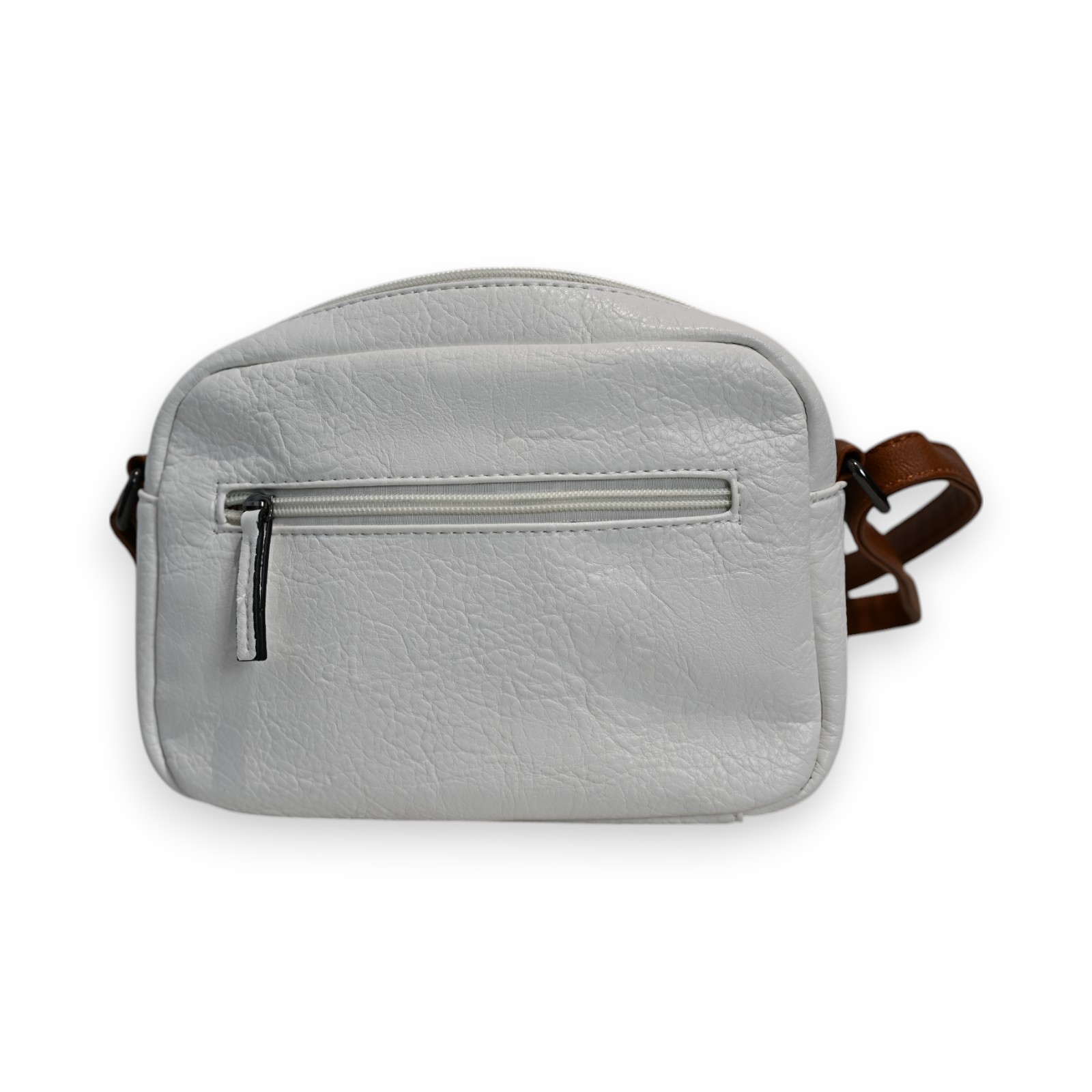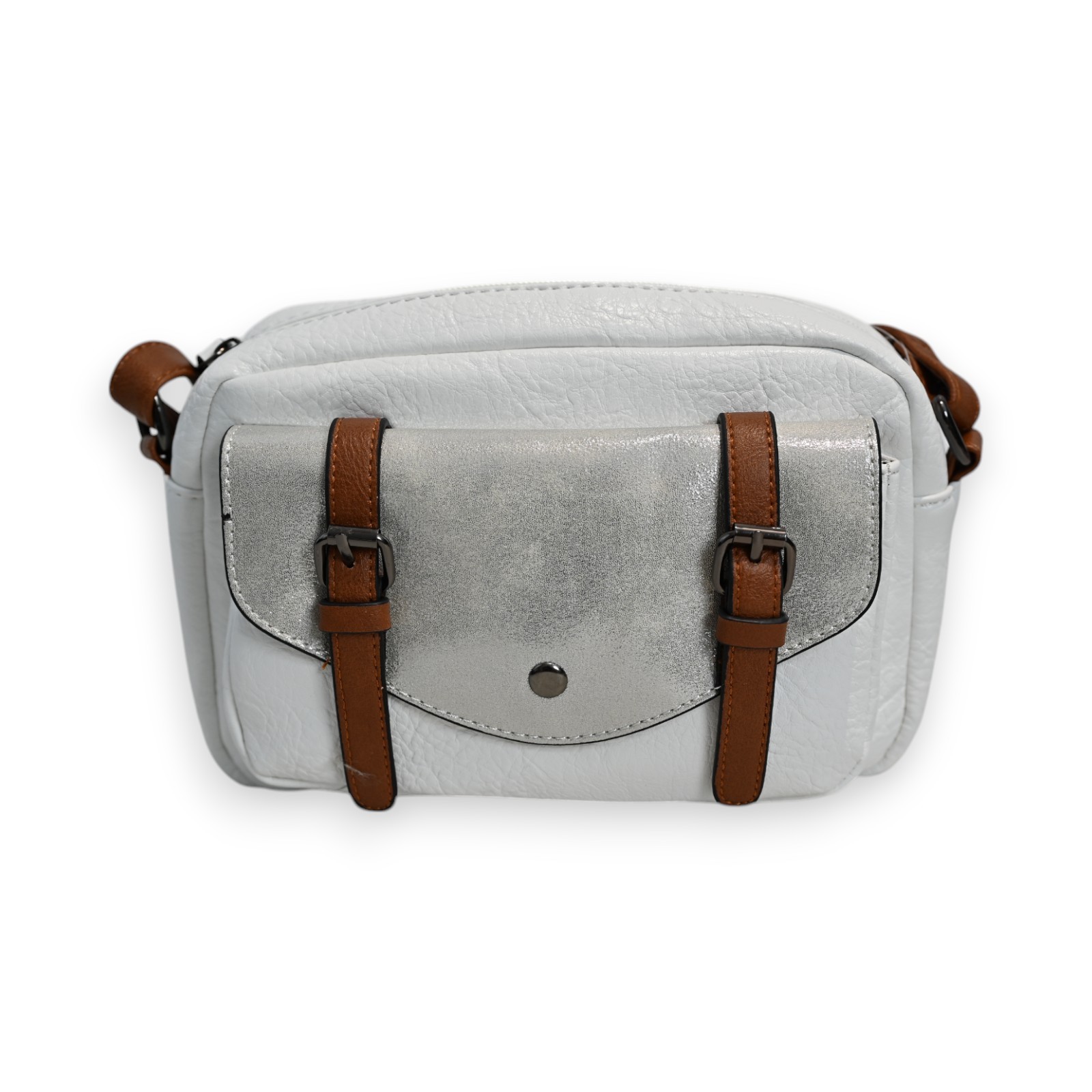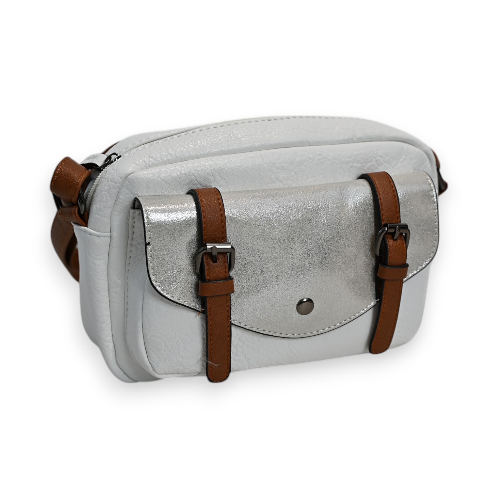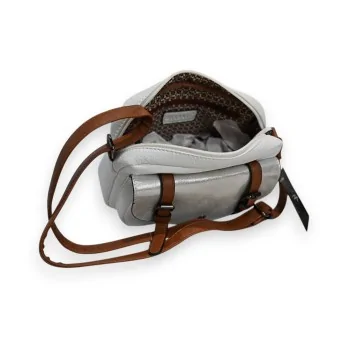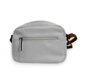 This Mélanie Paris crossbody bag stands out with its sophisticated look in white synthetic leather, enhanced by shiny finishes that give it a premium appearance. The front of the bag is highlighted by two decorative camel straps that create an elegant contrast and add a touch of character. The magnetic snap closure system combines security and ease of use, while metallic details bring a refined finish to the overall design.