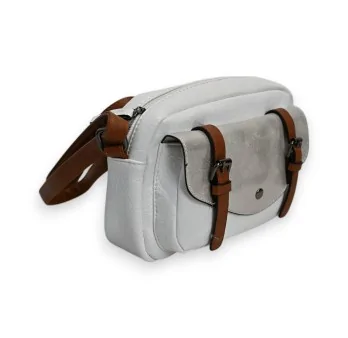 The Mélanie Paris crossbody bag combines elegance and practicality with its contemporary design in white synthetic material enhanced with shiny accents. Its distinctive front pocket features two decorative camel straps and a magnetic snap closure, while its spacious interior offers multiple storage options with a refined vintage lining.