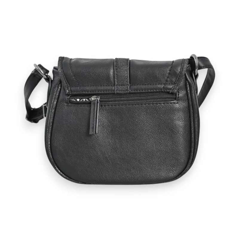 The Mélanie Paris crossbody bag combines elegance and practicality in a compact format. Its classic silhouette is enhanced by meticulous finishes, notably a decorative strap on the flap with a magnetic closure. The choice of timeless black and silver metallic details create a refined contrast that harmonizes with all dress styles. The synthetic material offers a sophisticated leather-like appearance while ensuring optimal durability.
