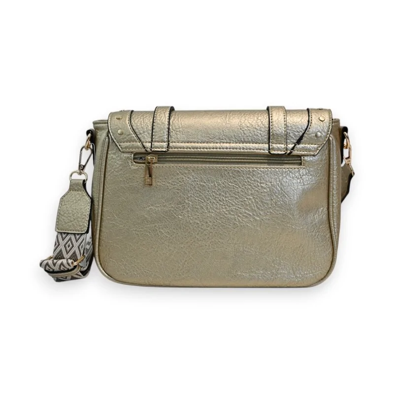 The Mélanie Paris crossbody bag stands out with its sophisticated retro aesthetic. Its sublime golden synthetic finish gives it a luxurious look, while its satchel-style details such as the square flap and decorative straps evoke a charm of yesteryear. The magnetic snap closure ensures practicality and security. The fabric shoulder strap with ethnic patterns adds a contemporary touch while remaining removable as desired.