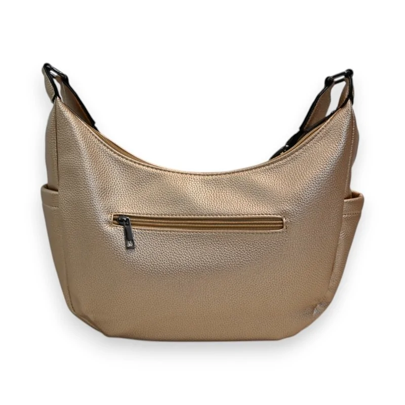 This Mélanie Paris crossbody bag combines elegance and practicality with its contemporary design in golden synthetic material. Its adjustable ethnic shoulder strap and multiple compartments make it the ideal accessory for an organized daily life. The bag features distinct zippered front pockets and a refined vintage lining that gives it a unique charm.