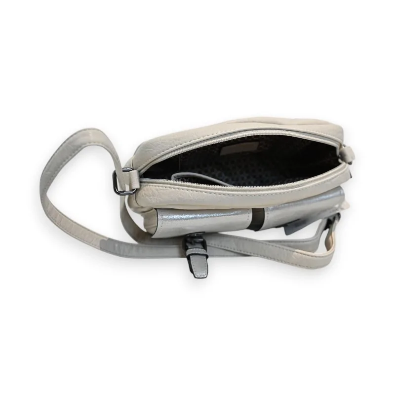 The crossbody bag from the Mélanie Paris collection stands out with its sleek and functional design. The beige synthetic material used perfectly replicates the look of leather, offering an ethical and sustainable alternative. The dimensions of 24 x 16 x 8 cm make it an ideal accessory for daily use, neither too big nor too small. The silver-colored hardware adds a touch of contemporary elegance that harmonizes perfectly with the neutral beige color of the bag.